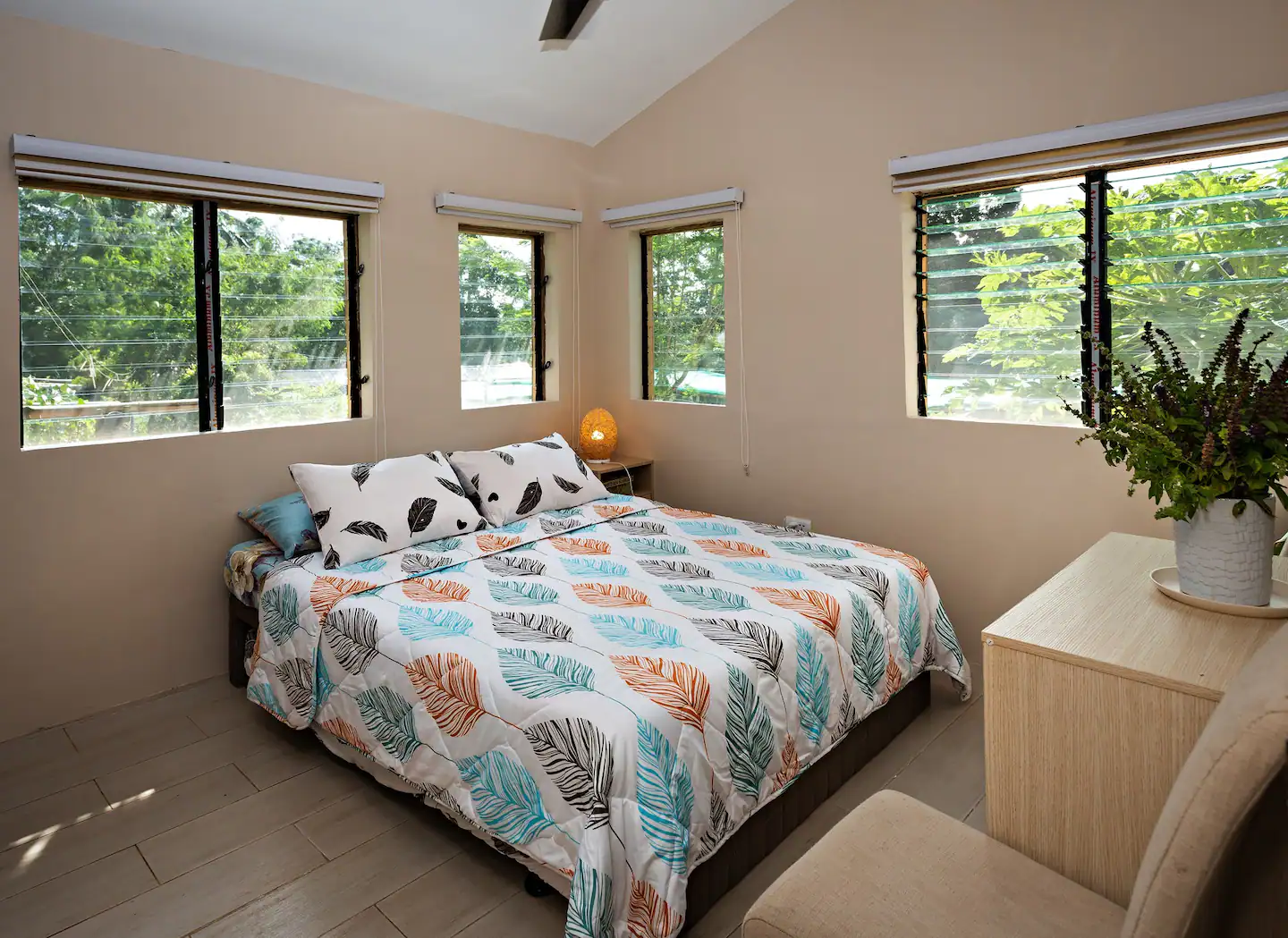 This modern farm cabin is situated at the top of our organic farm, with stunning views of Balayan Bay and Mindoro Island in front and a hint of Mt. Banahaw on the left. The cabin is fronted by 16 garden beds that produce 15-20 kgs of organic vegetables across 20+ varieties, giving you the opportunity to learn about sustainable farming at the same time will nourish your body with fresh, organic produce during your stay.